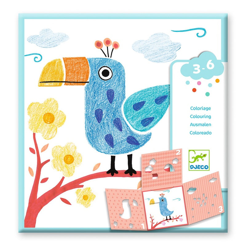 Create your picture using a single stencil, split into 3. Slide a sheet in and fold down the first stencil. Colour it in. Open it and do the same with the second and third flaps. The end result is a wonderful piece of art!