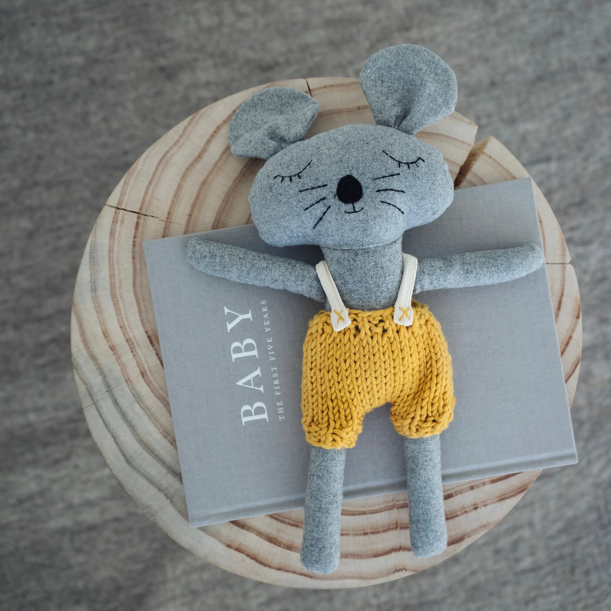 Charlie Mouse, one of our favourite forever friends. Made with the softest wool blend fabric, Charlie mouse wears knitted Australian merino wool overalls and loves collecting sticks and stones.