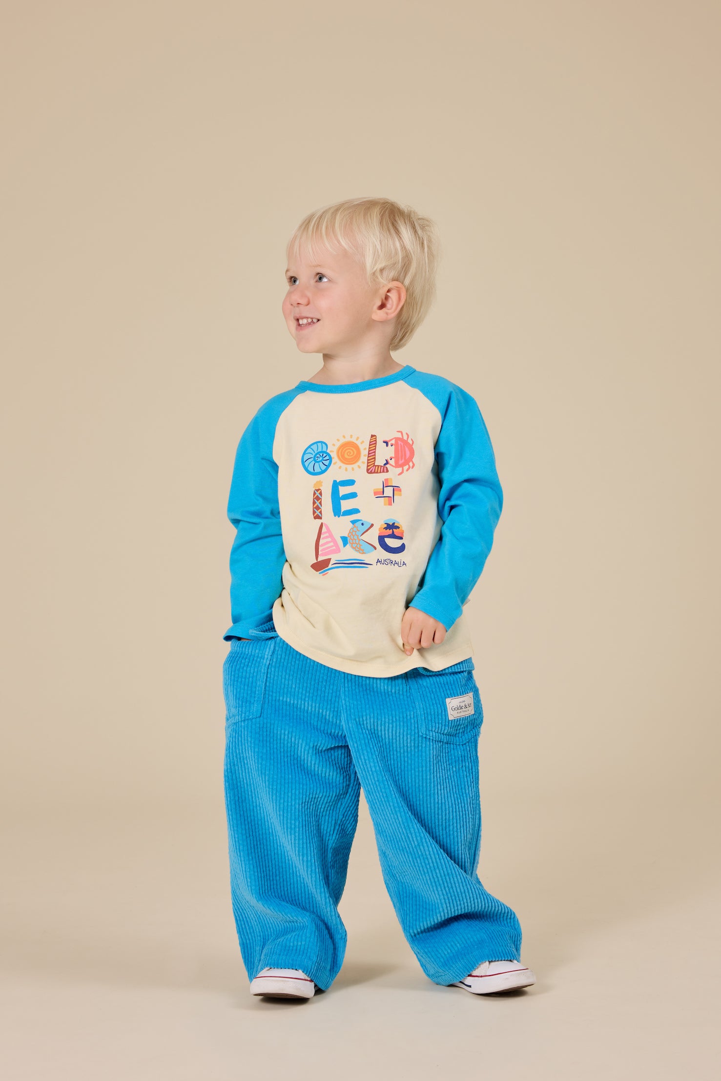 True to size. Relaxed fit raglan style long sleeve top. Hand drawn Australiana print. Snap buttons on neck up to size 2 for easy dressing.