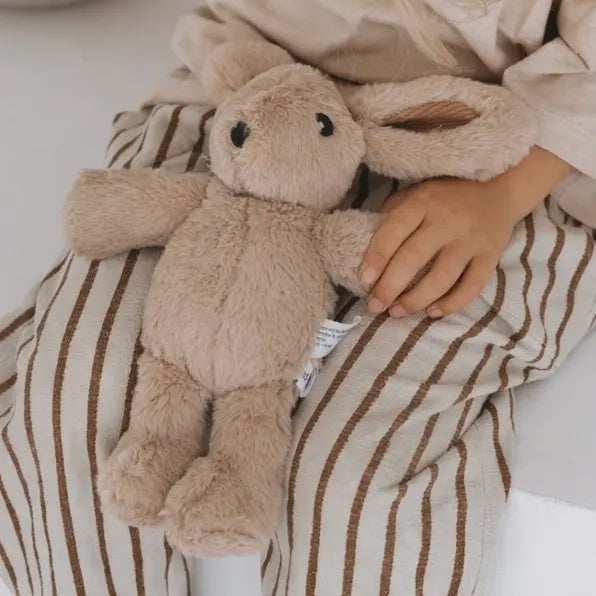 Hugh rabbit has an adorable caramel buttery soft fur and wears a caramel knitted scarf made with Australian merino wool and cream pom pom.
