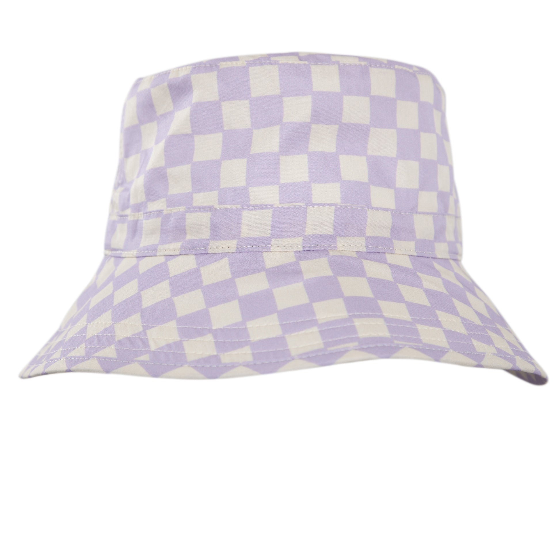 Bucket hat with a lavender cheked print on outside and on the inner brim.