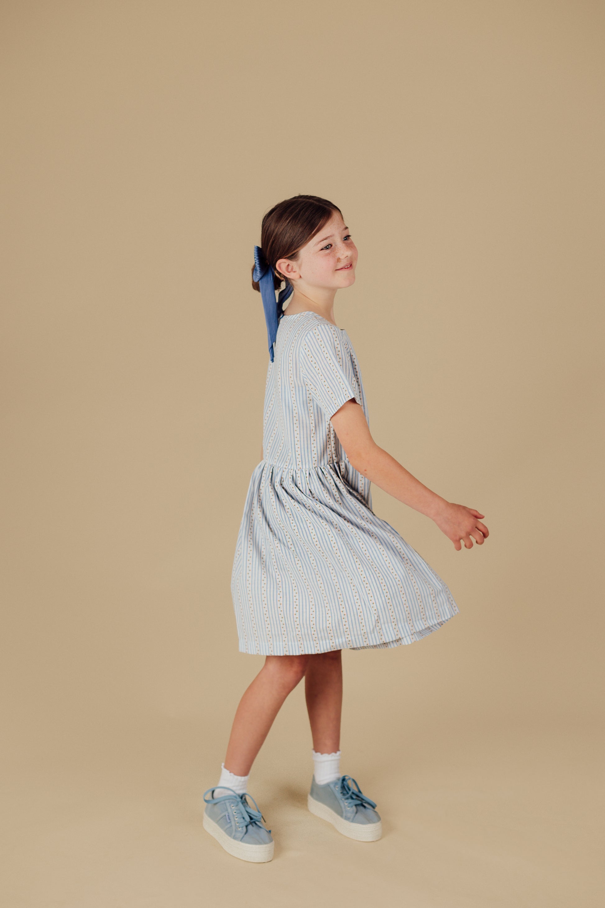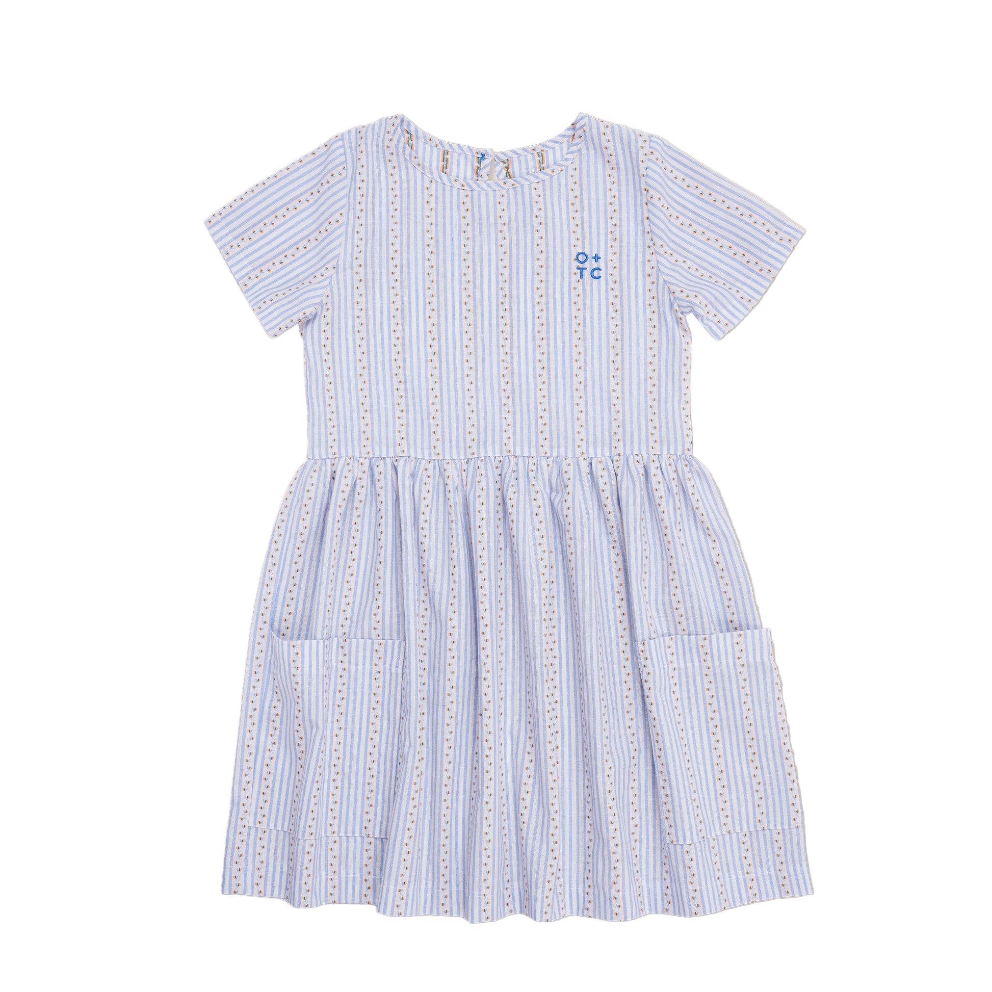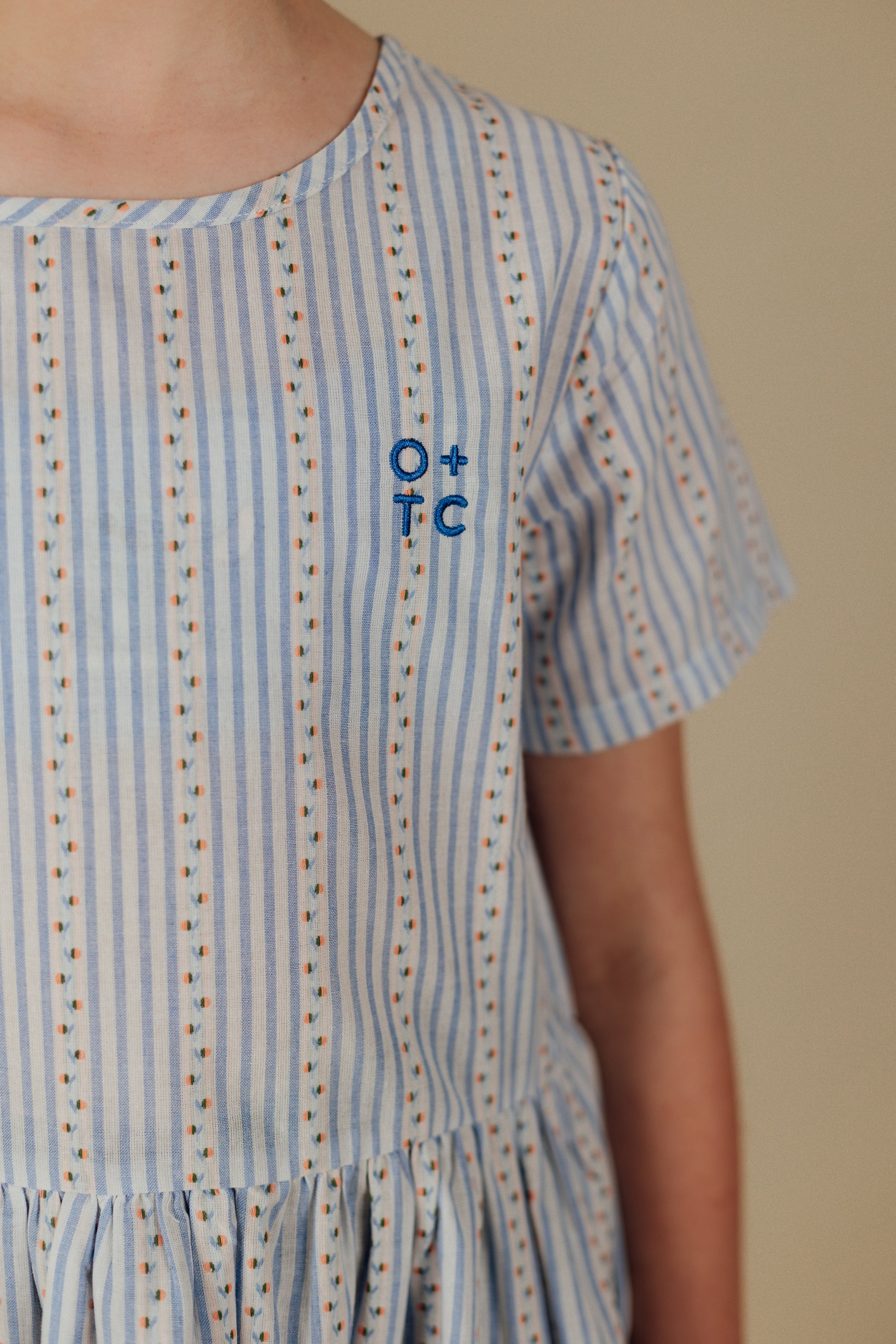 Our most popular kids cotton dress in a beautiful lightweight white and blue stripe, adorned with a trail of embroidered peaches. Two large pockets for little treasures and a button opening at the back make this every girl's dream dress that’s comfortable, playful, and twirl approved – perfect for casual playdates or summer outings.