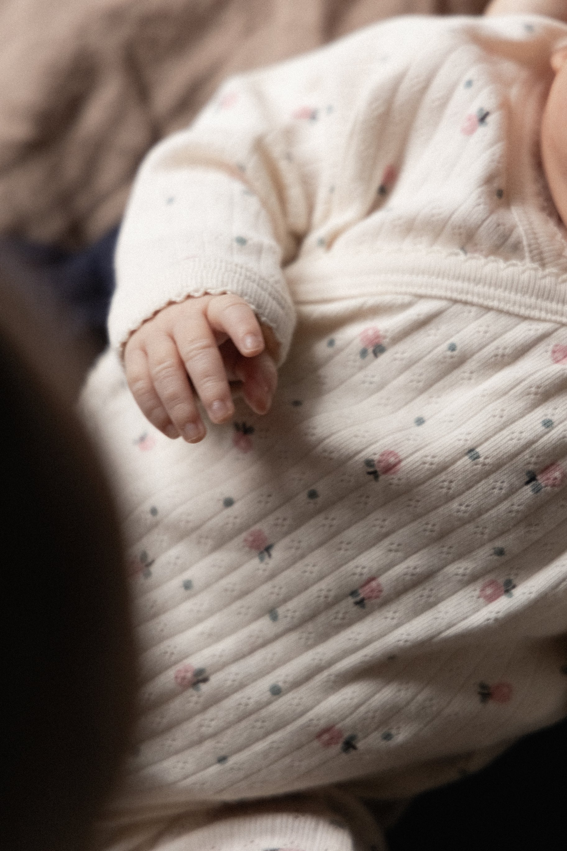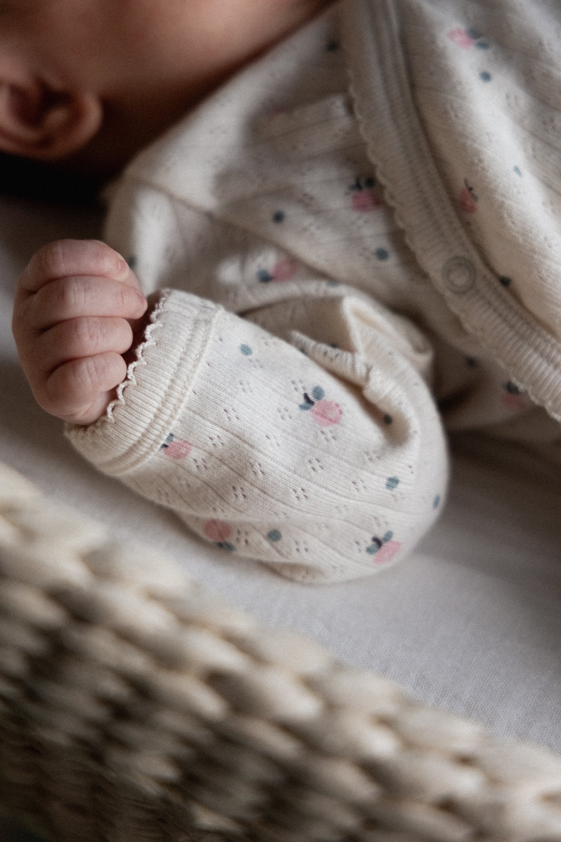Made in our beautiful pointelle fabric, it has a nostalgic quality and is super soft and stretchy. This delicate fabric is perfect for the first few weeks and months of life. To minimise shrinkage, this fabric has been pre-washed in a GOTS certified factory.