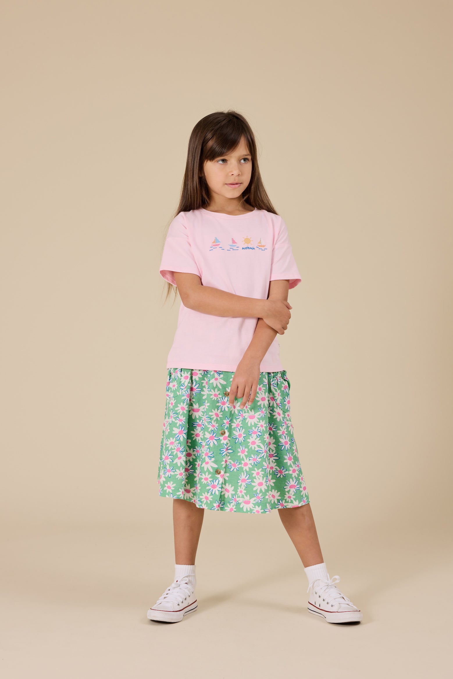 Featuring cross-stitch style embroidered sail boats. Snap buttons on neck up to size 2 for easy dressing.