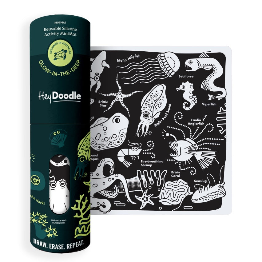 Dive into creativity with the Glow-in-the-Deep Mini Mat, a compact version of our best-selling glow-in-the-dark design from the HeyDoodle Classic range!