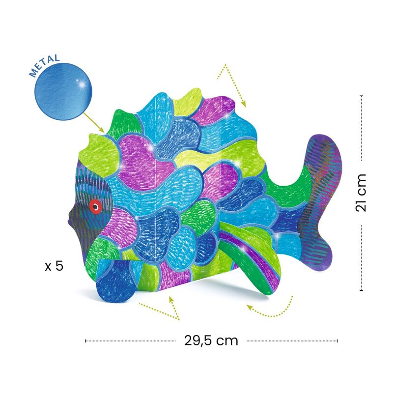 Dive into a world of colour and shine with this ocean-themed colouring set. This set includes everything little ones need to create a stunning underwater scene with metallic accents. First, colour in the intricate designs with your choice of colours. Then, fold and assemble the pieces to reveal a magical world that shines with its metallic details.