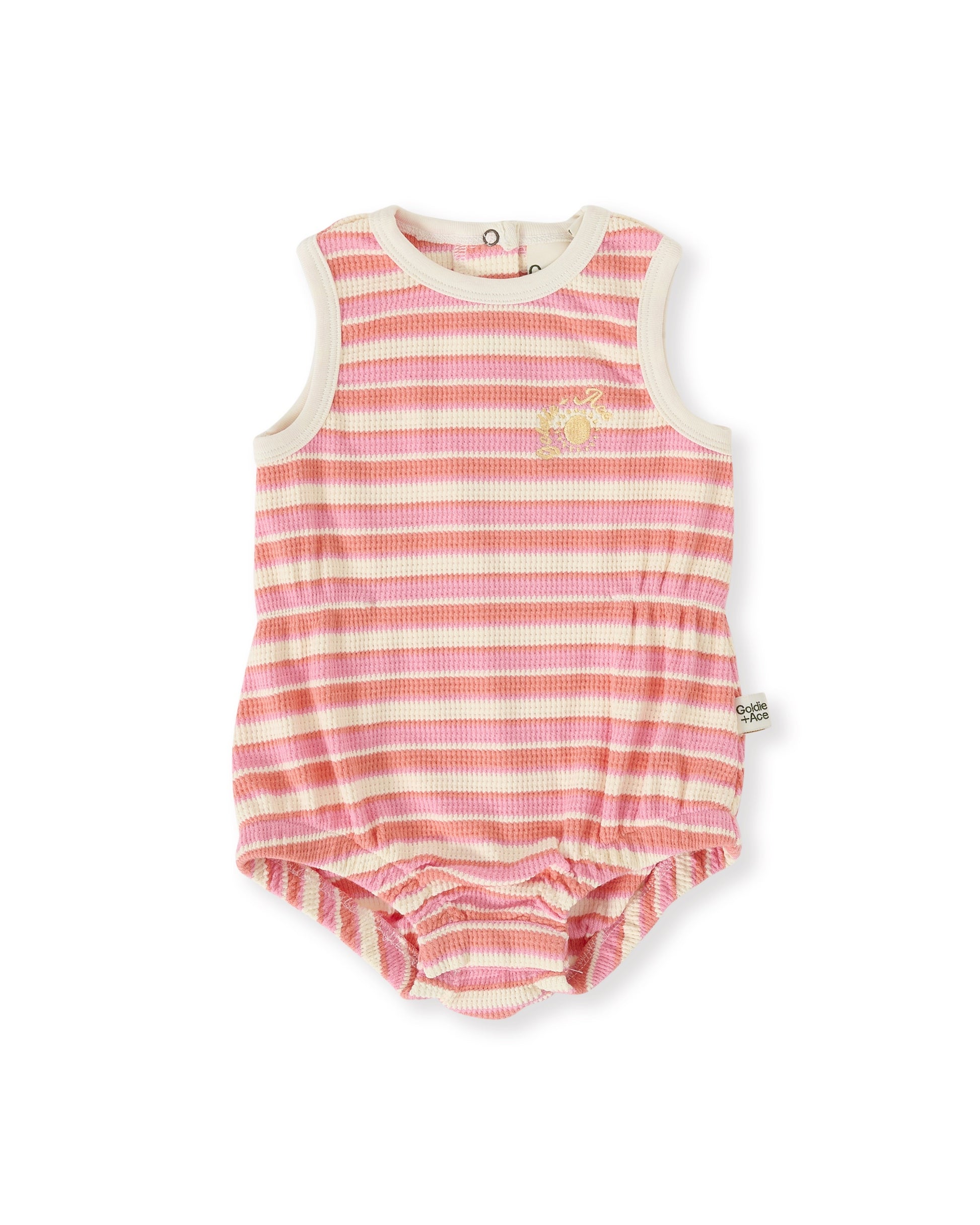 True to size. Relaxed fit. Snap buttons at nappy line and buttons on back opening for easy dressing. Elasticated waist and leg openings. Featuring an embroidered logo on the chest and a super soft cotton waffle fabrication.